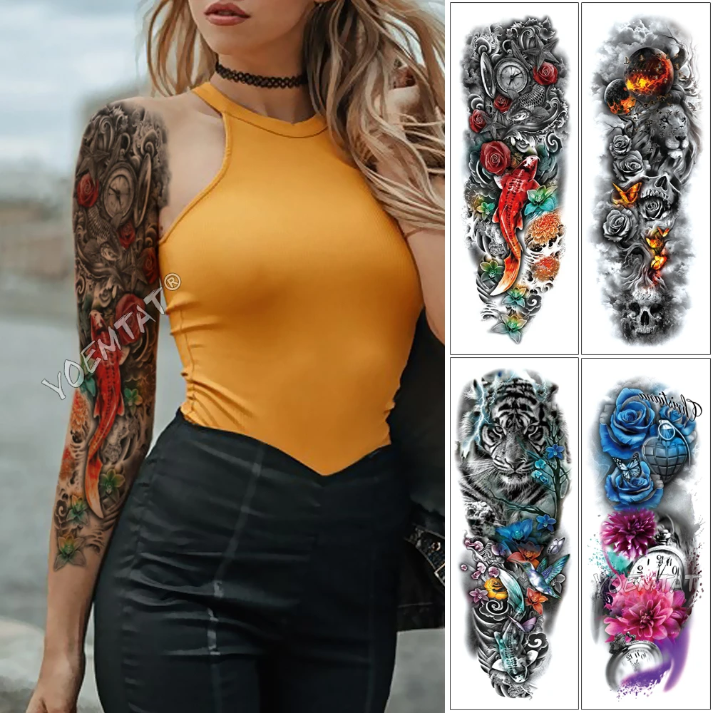 Large Arm Sleeve Tattoo Japanese Carp Clock Star Waterproof Temporary Fake Tatoo Sticker Skull Lotus Wave Men Women Full Tatto Temporary Tattoos Aliexpress
